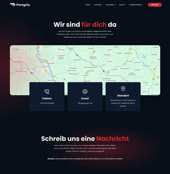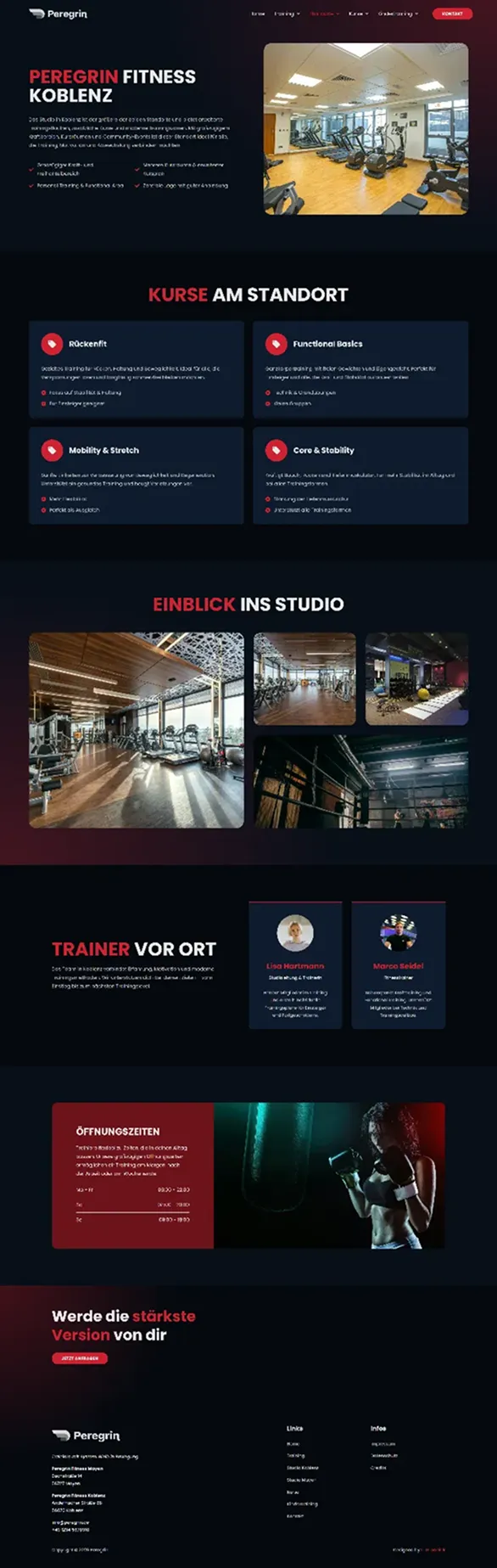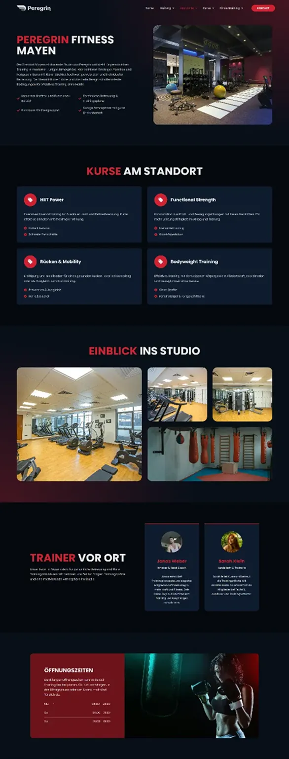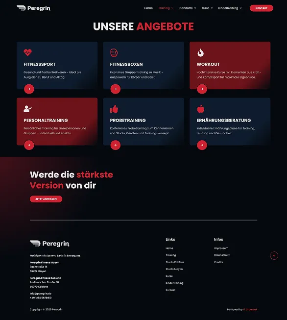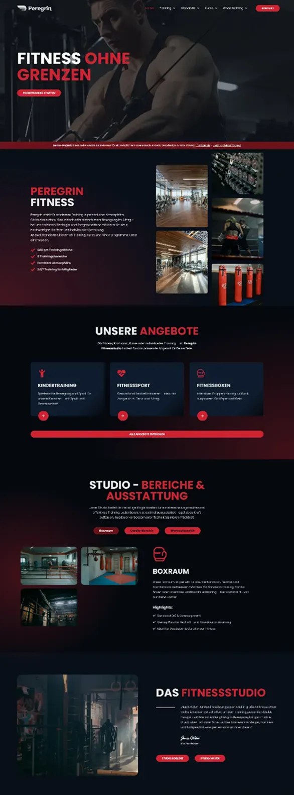 WordPress-Demowebsite mit modernem, responsivem Design für das fiktive Fitnessstudio Peregrin. Umsetzung inkl. Leistungsseiten, Projektübersicht, Kontaktbereich und SEO-optimierter Struktur – erstellt als Beispielprojekt zur Präsentation meiner Webdesign-Leistungen.